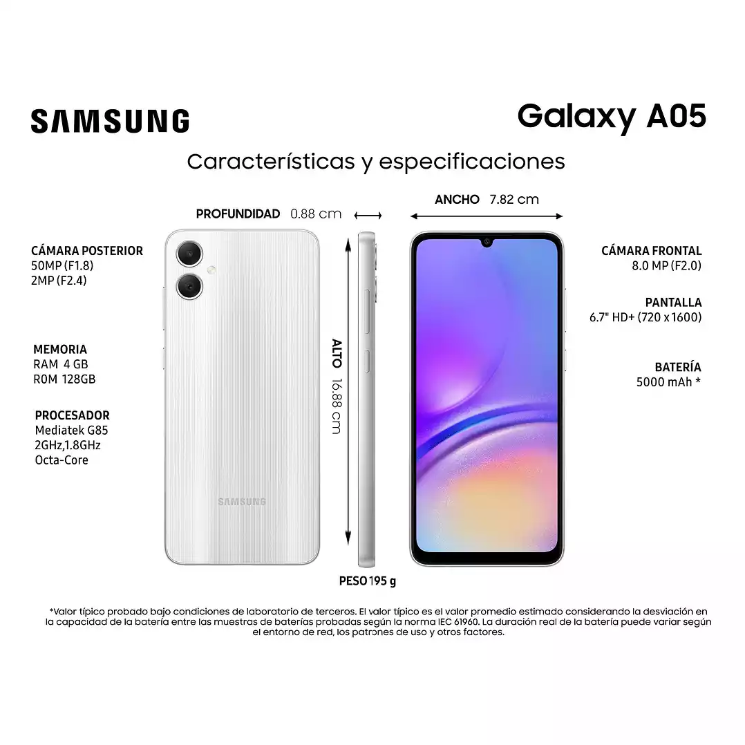 Ficha técnica Pantalla 6.7", 720 x 1600 pixels Procesador Mediatek Helio G85 2GHz Memoria RAM 4GB Almacenamiento 128GB Expansión microSD Cámara Dual, 50MP+2MP Batería 5000 mAh OS Android 13 Perfil 8.8 mm Peso 195 g