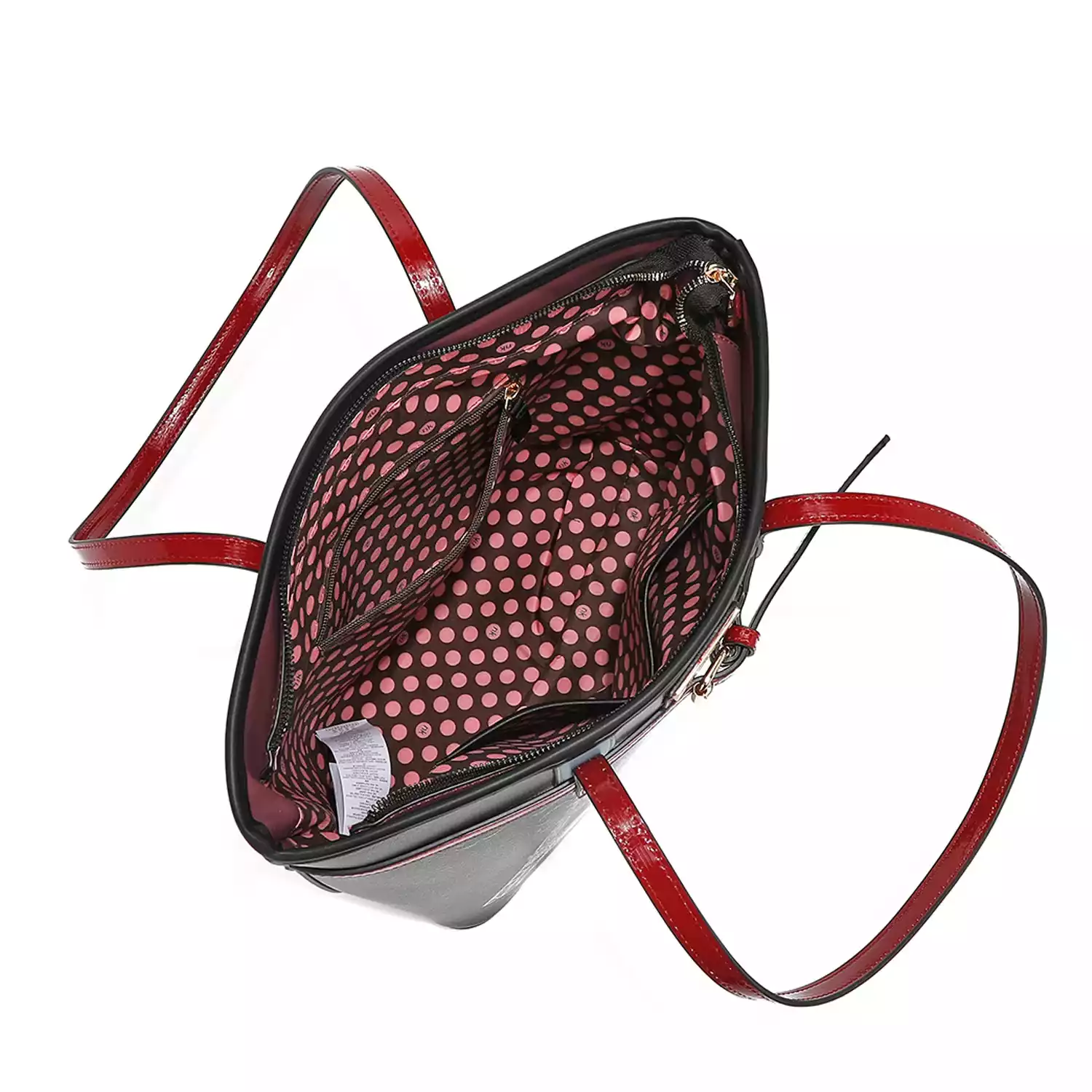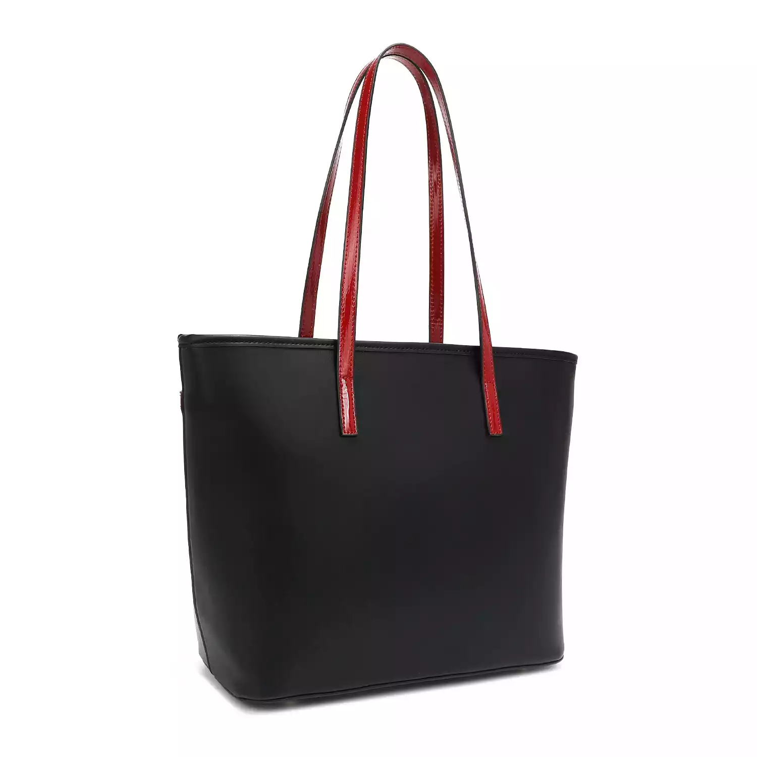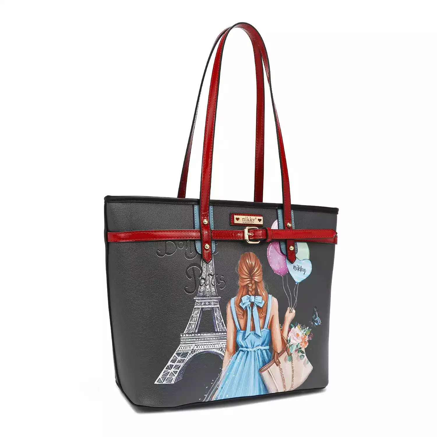 Made of high quality pebbled eco-leather. Main zipper closure with Nikky Logo zipper pulls. Top 10.5" dual eco-leather handles. Nikky gold-toned logo nameplate at front. Structured Silhouette with flat base. Exclusive Nikky signature print on front. Large spacious main compartment lined with signature Nikky signature heart print polyester fabric. Two open wall accessory pockets at front. One zip wall pocket at back. Size: 16"L X 5" X 10.5"H Weight: 1.50 lbs For cleaning, wipe with damp cloth.