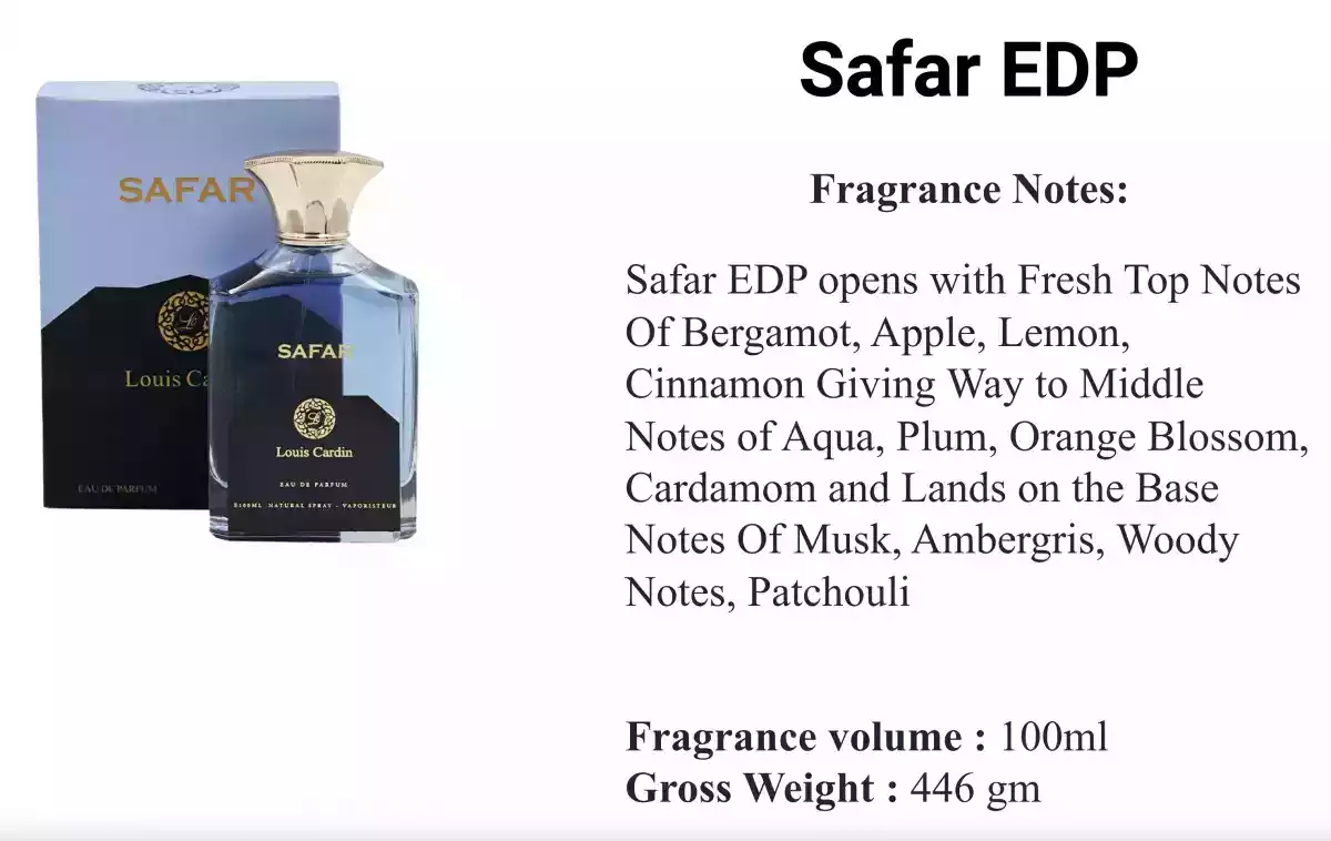Safar EDP abre con notas altas frescas de bergamota, manzana, limón, canela dando paso a notas medias de agua, ciruela, azahar, cardamomo y tierras en las notas base de almizcle, ámbar gris, notas amaderadas y pachulí.