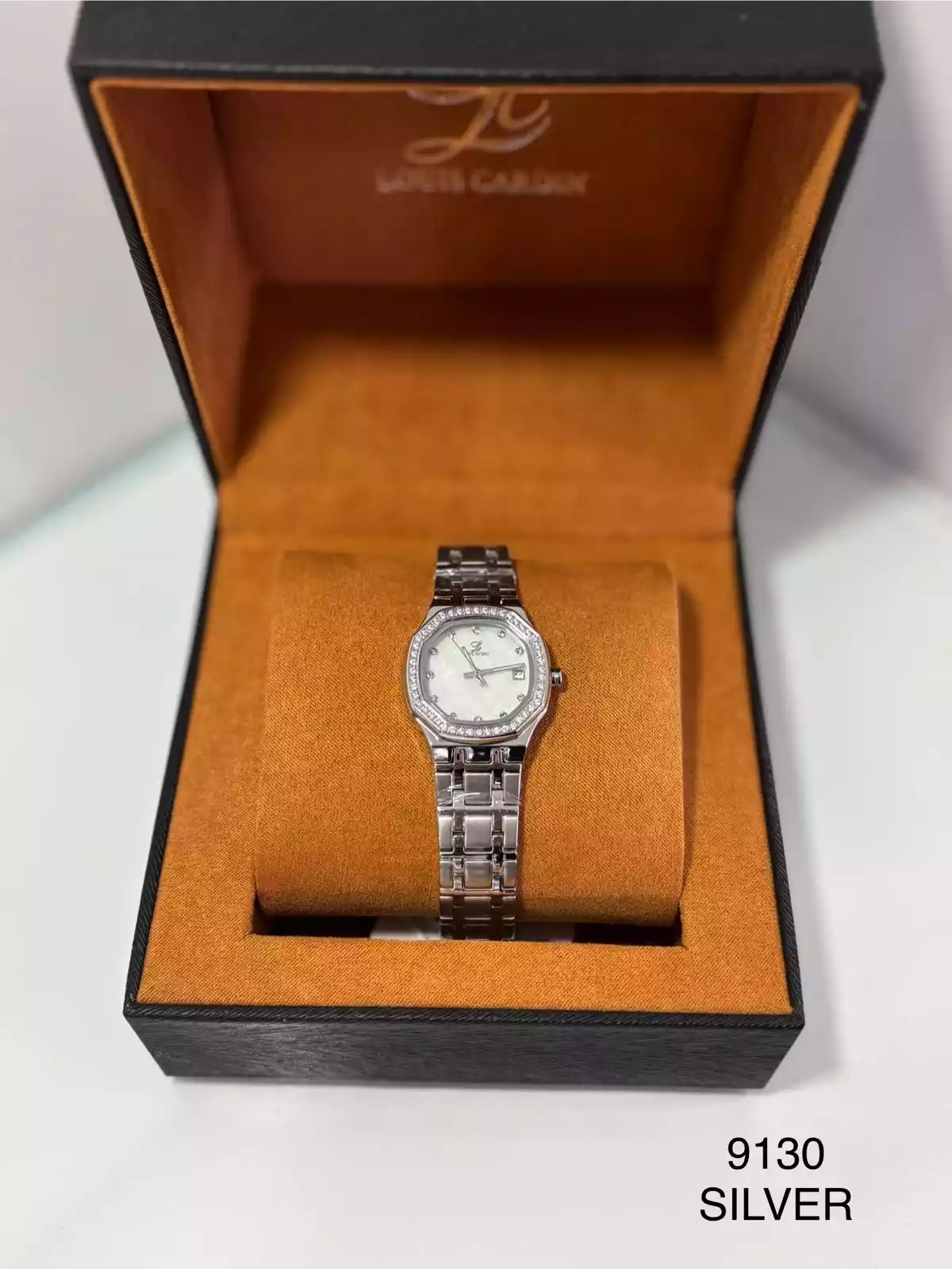 Modelo 9130 - Ladies Movimiento: Movimiento japonés Resistencia al agua: A prueba de salpicaduras (5 ATM) Tamaño de la caja: 28 mm Apertura del dial: 20 mm Tamaño de la correa: 16–14 mm Correa: Banda de acero inoxidable con hebilla tipo mariposa Diseño: Una colección sofisticada de relojes para dama, con bisel octagonal, marcadores de hora con cristales brillantes y una variedad de colores deslumbrantes en el dial. Adornado con piedras cúbicas Swarovski.