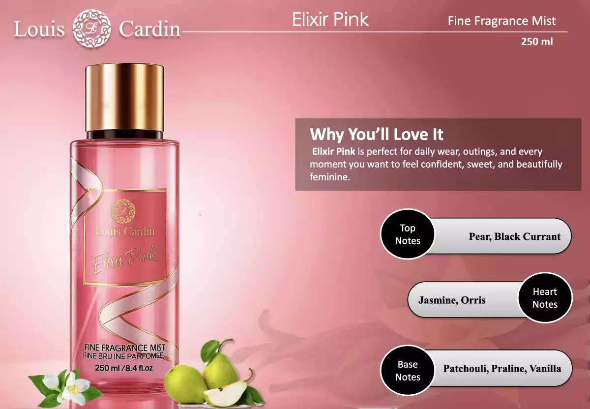 Elixir Pink es perfecto para el día a día, para salir y para cualquier momento en que quieras sentirte segura, dulce y bellamente femenina. Notas de pera, grosella negra, jazmín, raíz de lirio, pachulí, praliné y vainilla.