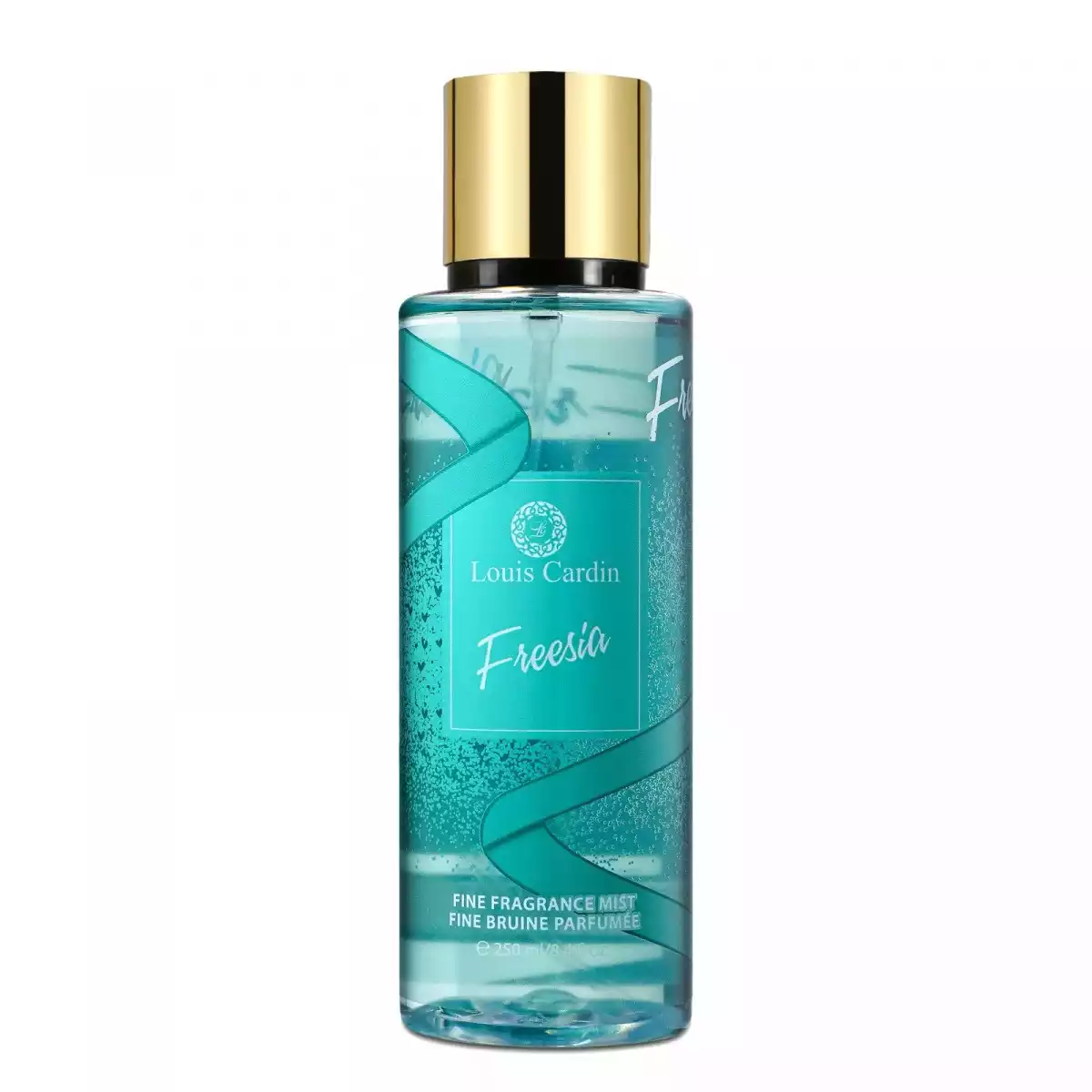 Fressia Body Mist de Louis Cardin se abre con un olor floral con fragancias frescas de madarina, pepino, fresa y melón, dando paso a notas medias de violeta, rosa, jazmín, notas verdes, notas de fondo de ámbar, vainilla, sándalo y almizcle blanco.